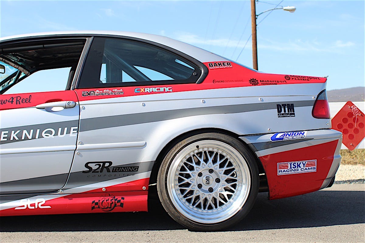 As it sits now, the exterior features an M3 hood, a CSL front bumper with carbon fiber splitters, custom-made M3 overfenders in the rear, a custom livery by Fuzion Teknique, and 18×9.5/18×10.5 ESM-017 wheels with Achilles tires. It sits on Feal 441 coilovers with 9k Swift springs in the front and 4k Swift springs with a true coilover conversion in the rear. Massive Brakes dual caliper brackets hold Brembo brakes in the front and Wildwood brakes in the rear. An M3 rear differential, crash bars, SLP control arms, and a SLR super angle kit make for the perfect drift machine with with up to 70 degrees of angle.