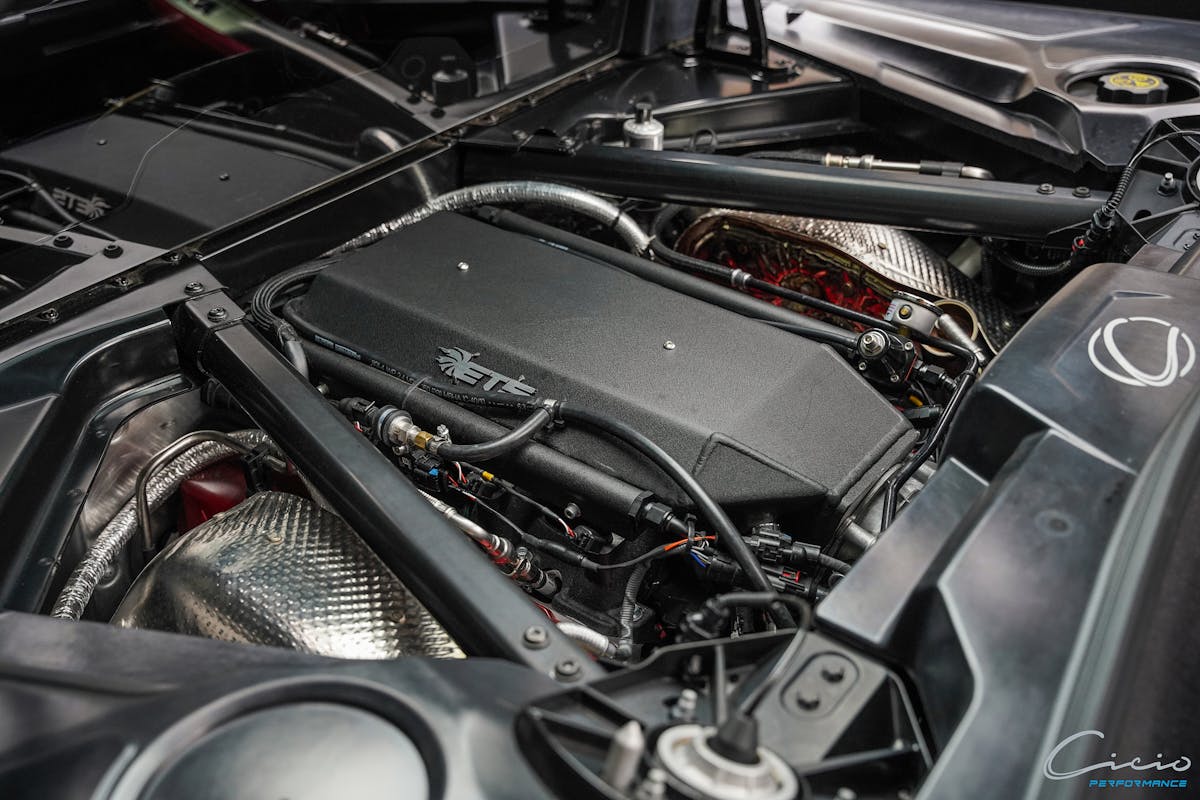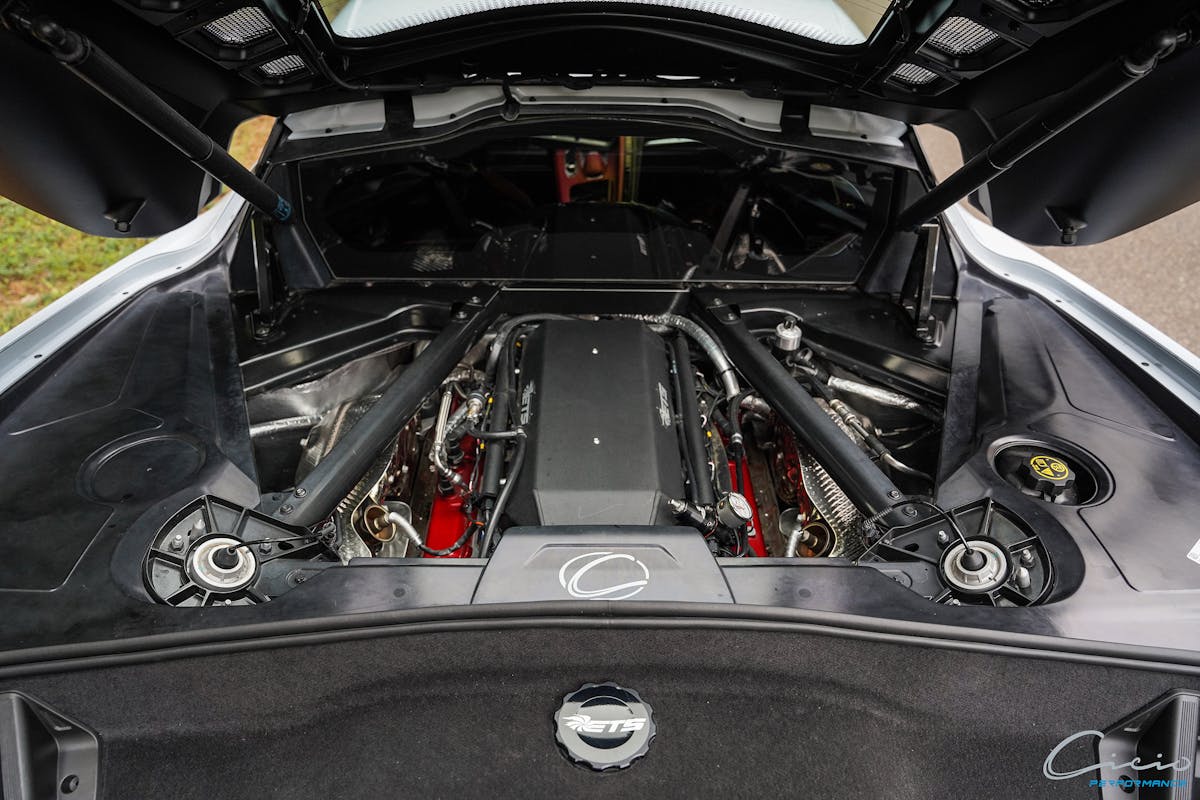 The factory LT2 intake manifold was removed and replaced with an ETS intake, adding eight additional 1,700cc injectors to the top side of the engine. The MoTec ECU, tuned by Taylor Leier of Cico Performance, controls the secondary units while the factory ECU handles the direct injection. Other additions include a fuel cell in the “frunk” for additional fueling with E85, Aeromotive regulators, and an ETS air-to-water intercooler.