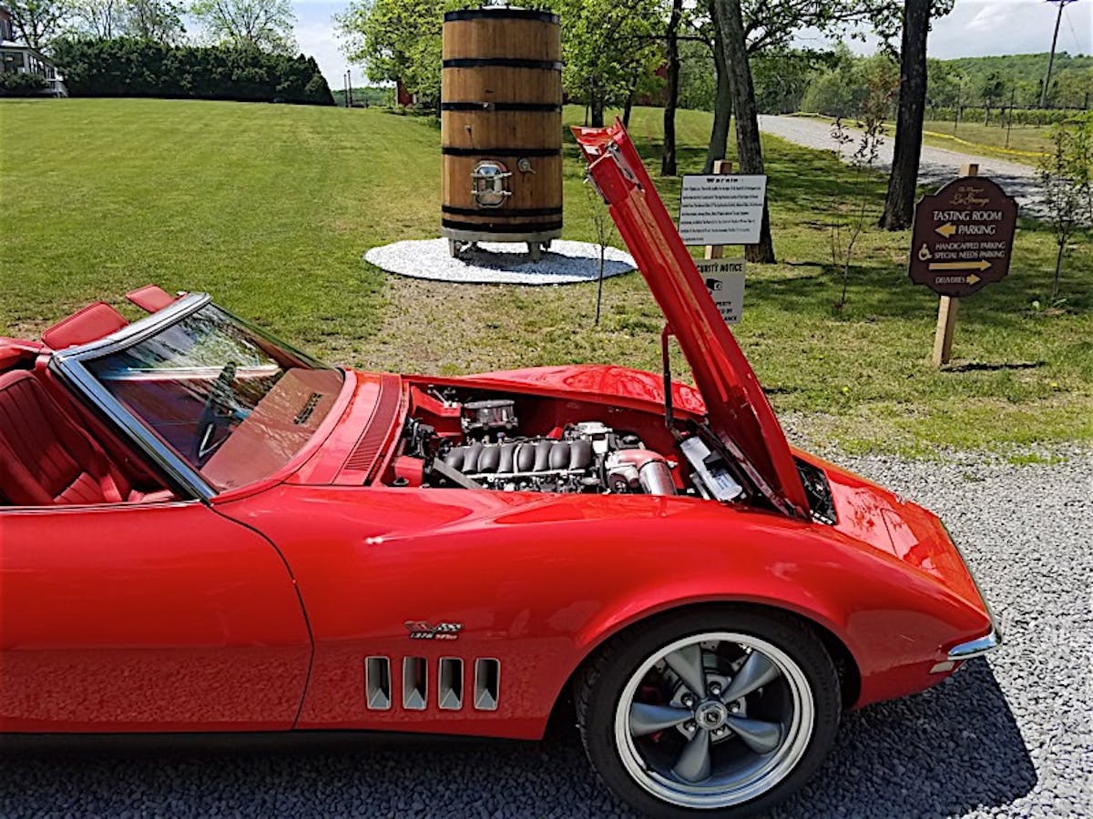 They took a rusty old ’68 roadster from Rochester, New York and like the scene from “The Wizard of Oz”– where the unlikely foursome are refurbished after they reach the Emerald City — this original red on red ‘Vette emerged with its late ’60s cool intact and a new lease on life.