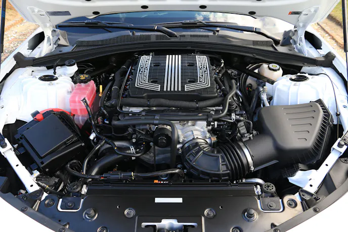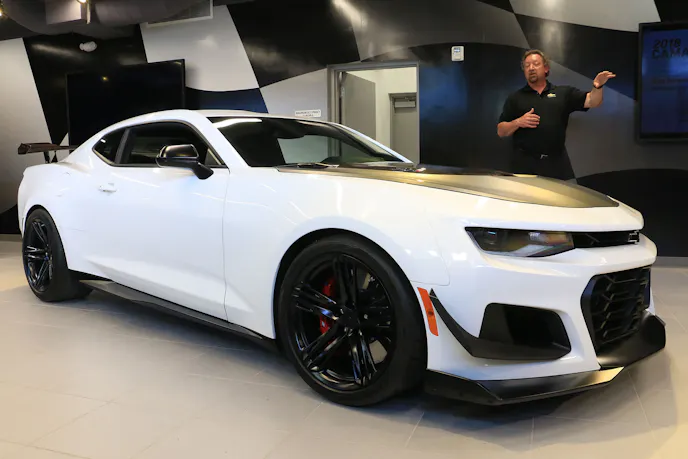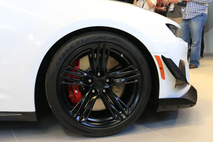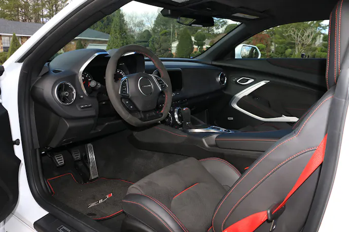 Said to be a whole three seconds faster per lap around GM’s 2.9-mile Milford Proving Ground road course, the ZL1 1LE ditches the standard car’s adaptive magnetic ride control suspension for an ultra-trick, ride height-adjustable Multimatic DSSV setup with monotube dampers, much like those seen on the fifth-generation Camaro Z/28.