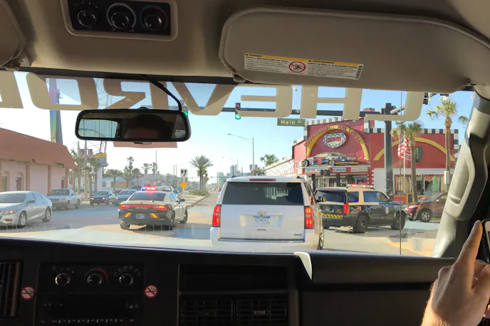 If you’ve ever wanted a false sense of importance, I recommend starting your day off with a police escort. That’s exactly what we did, heading to the speedway under the protection of a rolling road block set up by Daytona Beach’s finest. With more than 100,000 race fans pouring into the facility it certainly hastened our progress into the venue, which otherwise might’ve taken hours.