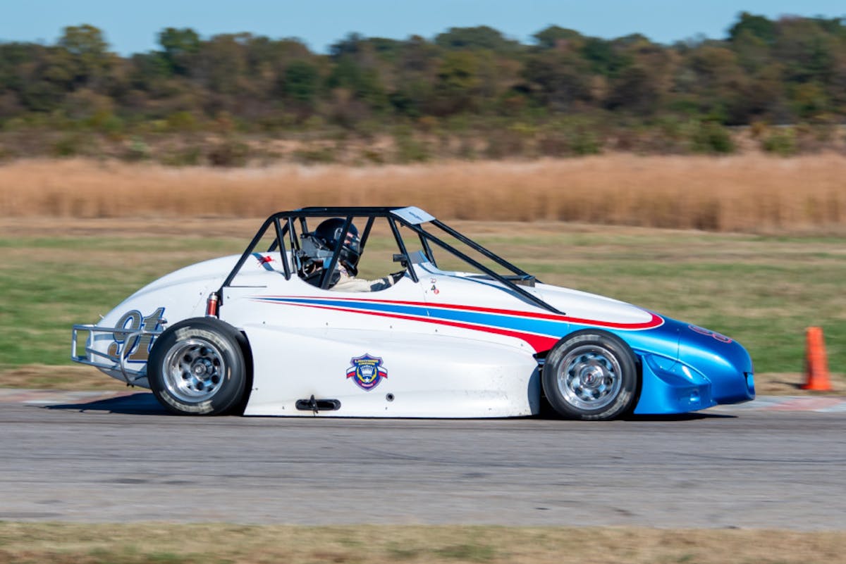 They designed crush structures to better absorb higher-speed impacts. The nose and side pods prevent wheel-to-wheel contact, which often launches cars into the air. The body eliminates lift, which the old Silver Crown cars struggled with at larger tracks. They built the car with a centerline balance — unlike a typical left-weighted oval-track car — to not necessarily run road courses but to reduce corner speeds.