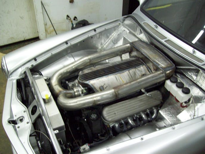 To power the Pro-Touring Volvo, Jackson replaced the factory four cylinder with a 600-plus horsepower LS3 V8 backed by a Tremec 5-speed. It is interesting to note that the aluminum block LS3 with the custom front suspension and cross member ended up lighter than the factory suspension and four cylinder. Topping the engine are custom-fabricated intake tubes that utilize the factory heater duct at the base of the windshield. “I used the cowl vent as a fresh air intake for the motor by building a filter box that attaches where the factory heater box did,” Jackson explains. This allowed him to fashion a dual intake runner setup that runs along the top of the engine from back to front, and curves into the front where it is solid mounted onto the front of the intake.