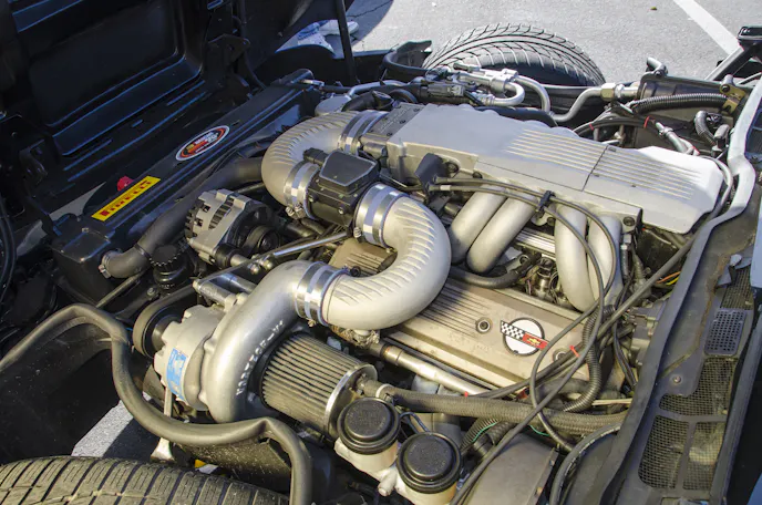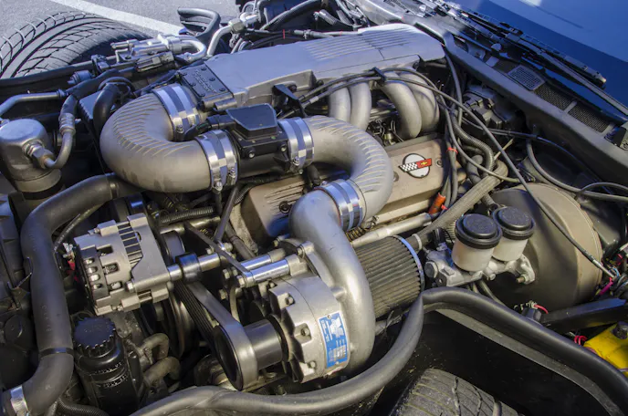 To elevate the power, he bolted on a Vortech supercharger, along with inserting a Traco cam and doing some cylinder head treatment, raising the output to 420 hp (439 lb/ft of torque), when running about 10 pounds of boost. A tuned Flowmaster twin-pipe exhaust system venting through two inline resonators facilitated engine breathing as well. While this peak of power was not as lofty as the coupe’s heady level, recall that base Corvettes of this era supplied only 250 to 300hp, so the convertible was certainly no slouch.