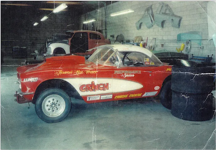 In 2001, he found the 1957 Corvette featured here advertised for sale in California. It’d been a big-block drag car in Hawaii, and had seen a hard life before returning to the mainland. Jim says “The original car was just a run-of-the-mill ’57 Corvette. It came from St. Louis as a red car with a base small-block V8. When I acquired it, it had no motor or transmission and although the body was solid, it had radiused rear wheel wells for drag slicks.”