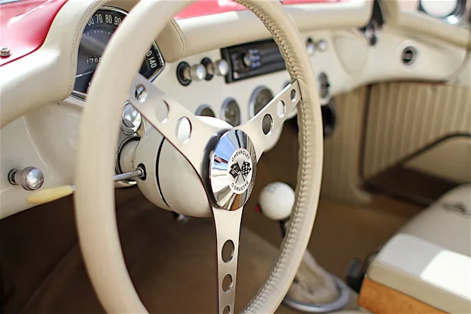 Jim says, “The decision to have Newman make up a set of 16 inch modern steel wheels with ’57 dog dish hubcaps came from my fond appreciation of 1957 Corvettes with the big brake option and all of them rolled off the line with the small caps back in the day.” The car currently rides on 16 inch, blackwall Michelin radials.