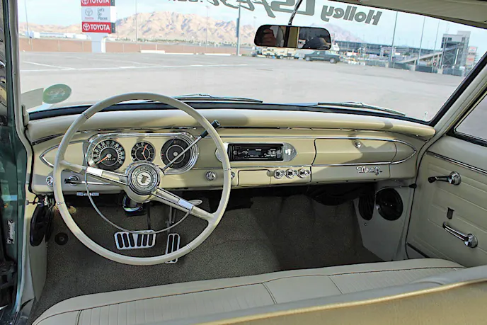 While blue interiors may be unique, they are far from desirable, so Joe ditched the color in favor of a stock-replacement kit in a vastly more appropriate tan color. Joe actual recovered the seats himself in his kitchen and installed the headliner as well. The color is a much better fit with the Alpine-Green exterior and is a lot less kitschy than the era-appropriate blue.