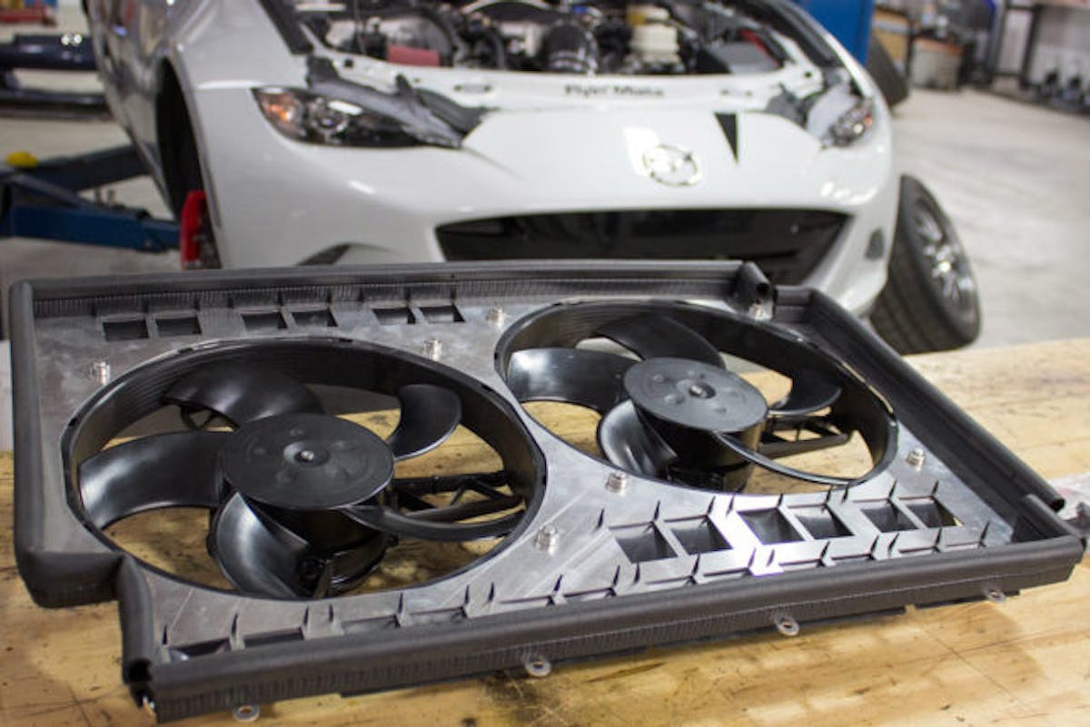 It’s one thing to shoehorn a big engine into a small car, but it’s quite another to make it reliable, and proper cooling is a huge part of that equation. Here we’re getting a look at the radiator shroud used in the conversion, which is designed for the custom radiator that’s been built for this car and mounts two very high torque fans for maximum airflow. The shroud is sealed against the radiator and the flaps allow air to bypass the shroud when the fans aren’t running. Image: Flyin’ Miata