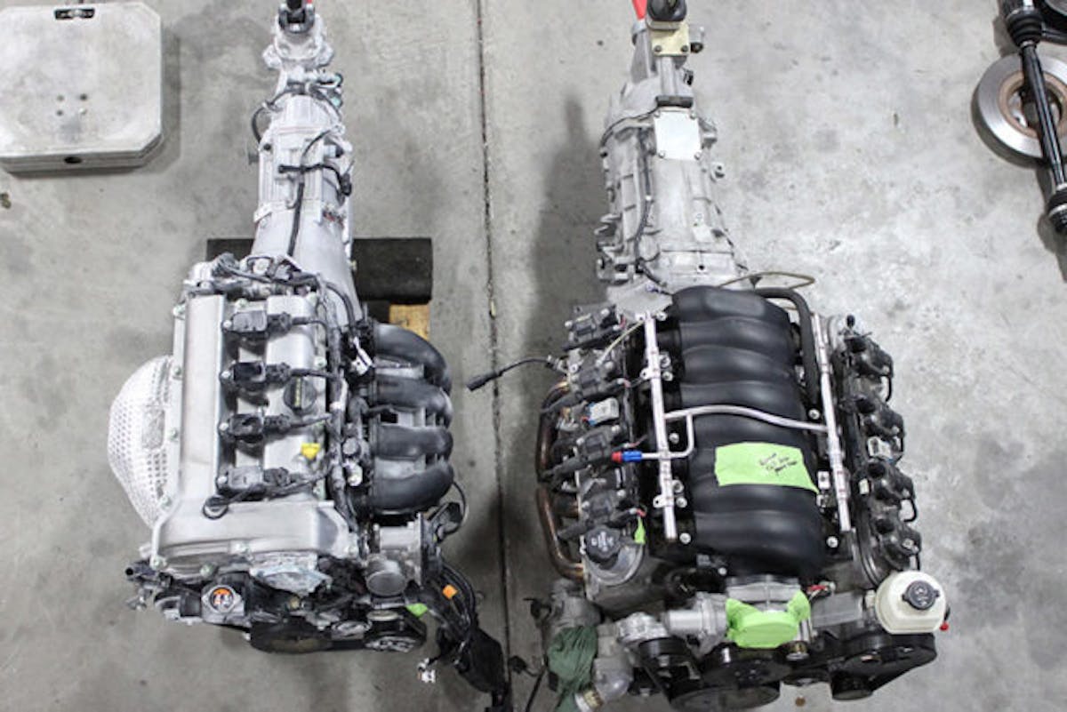 Here we get a side by side comparison between the stock MX-5 engine and gearbox (left) and the GM LS3 paired with the Tremec six-speed. Though the V8 is obviously larger, the disparity isn’t as significant as you might think. Image: Flyin’ Miata.