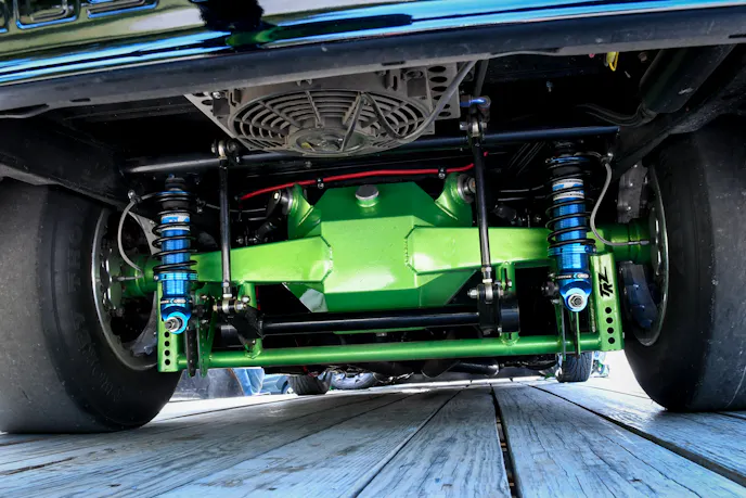 You can’t put that much power down and expect the stock rear suspension design to knock out competitive 60-foot times. Out back, Merillat torque boxes were welded into the stock frame rails to give the unibody some much-needed rigidity and adjustability. Team 2 control arms connect a Moser M9 Fabricated 9-inch Ford axle with 3.70 gears and 40-spline Strange Engineering axle shafts to the welded-in torque boxes. The weld-in torque boxes are a must for any high-horsepower LS-swapped Fox Body as the hard launches pull the factory metal apart.