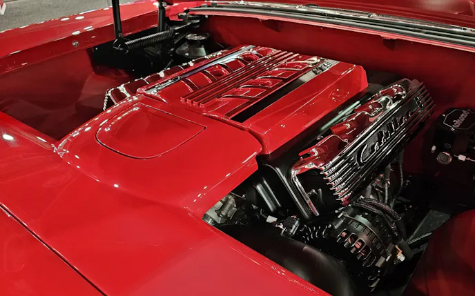 The interior saw a metamorphosis as well. The car’s formerly turquoise cabin had seen better days. Paul Atkins Interior out of Hanceville, Alabama, tackled the cockpit. They added 1959 Cadillac bucket seats, a custom console, and then covered everything in red leather. Dan Baker from Alumicraft fabricated interior pieces that have been “extinct” for some time. Mike’s team added Vintage Air, for front and rear passengers, Dakota Digital gauges, and a Bluetooth sound system from RetroSound. The icing on the cake was a small-diameter custom steering wheel that looked like it came off a GM assembly line in 1957. Again, Mike Curtis of Curtis Speed did an outstanding job.