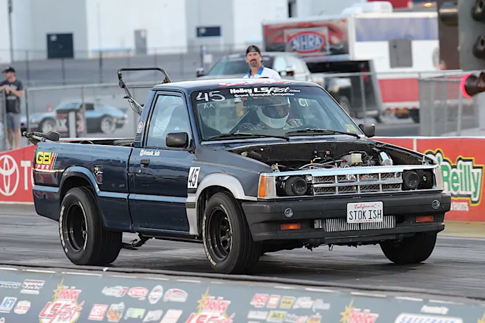 We couldn’t think of a better name for such an awesome little truck. Jeff just leans into the jokes that some may make about it, one of them being that many tell him it looks like a landscaping truck. That’s why he’s mounted a lawnmower and weed whacker in the bed secured by 1/2-inch bolts that pass through the frame of the truck. It has passed safety inspection several times in this very configuration and was making passes all weekend at LS Fest West just as you see it now.