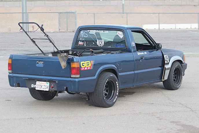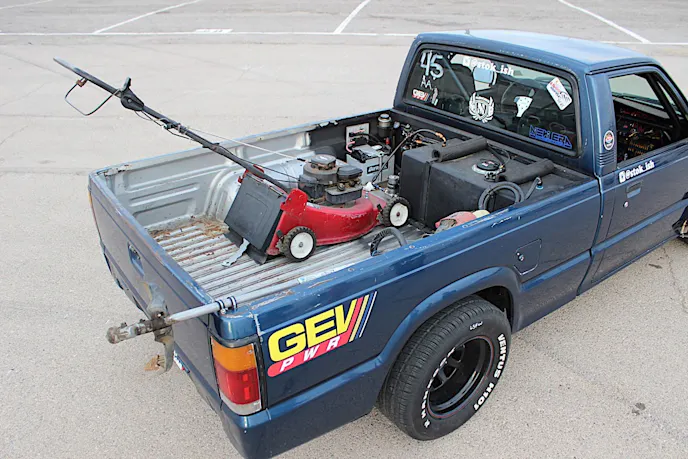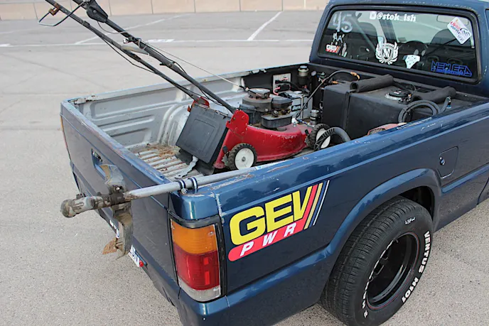You won’t find any billet valve covers on Jeff’s truck, nor will you find insane high-dollar components that cost an arm and a leg and end up spending more time hard parking than actually doing what they were designed to do. No, the only parts you’ll find on Jeff’s Mazda are parts that make it an absolute rocket—well, and a lawn mower and weed whacker, but we’ll get to that.