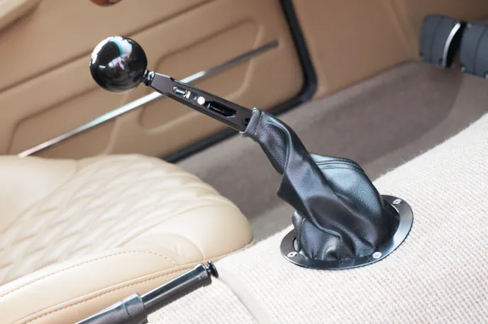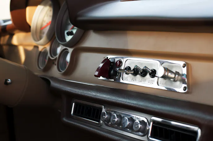 Because this car was built to go fast and be driven hard, a roll cage was installed winding its way through the custom leather interior. The AutoMeter gauges glow red to match the red paint of The Red Pig. A custom leather bucket driver’s seat will help Josh stay in the correct position as he rips through the autocross course.