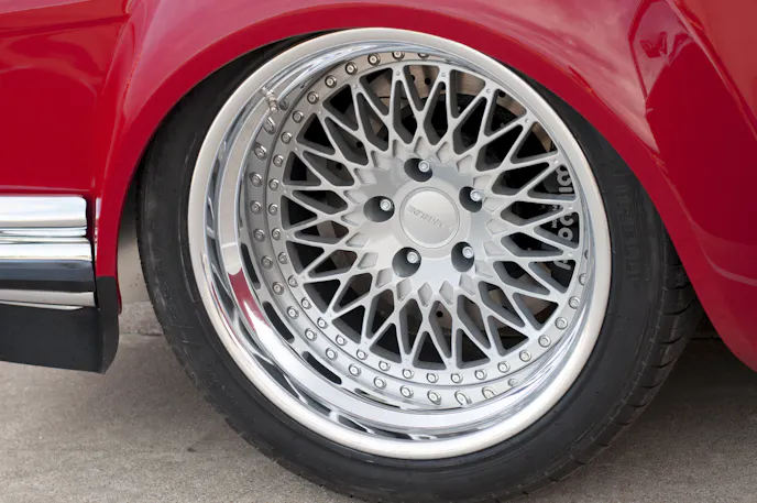 To help this big German luxury vehicle (now resto-mod track beast) carve the corners, the guys decided to utilize a set of Ride Tech coilovers. An adjustable sway bar was also added for tuning the setup at different courses. The Art Morrison Suspensions Bikini Clip was chosen as the front independent suspension. A DSE power steering rack was installed for ease of turning the massive front Pirelli tires. Wilwood 6-piston brake calipers were chosen to effectively slow the big car down.