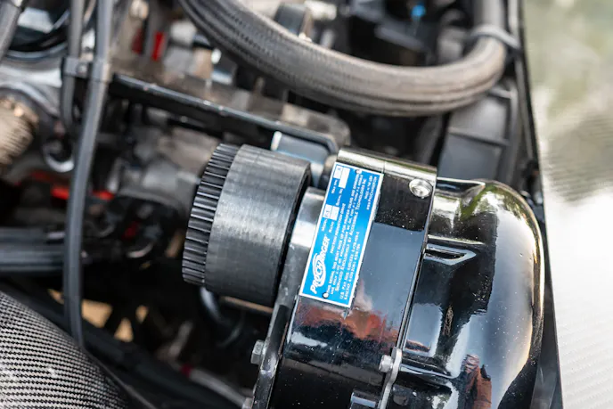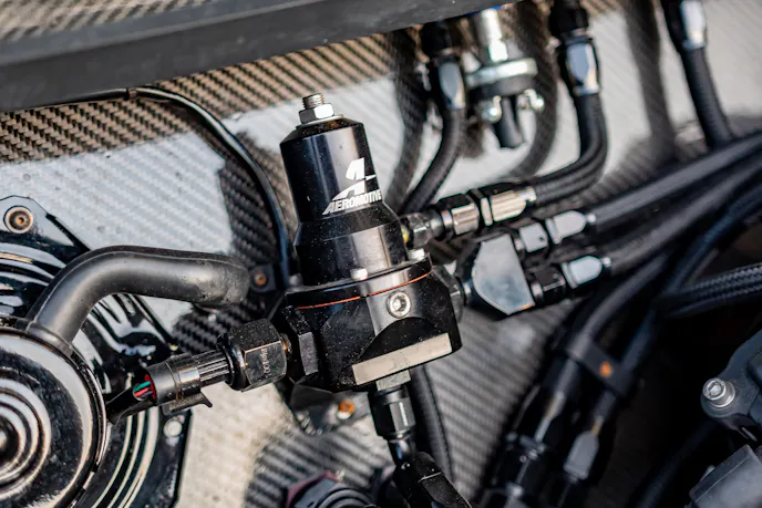 Back on the piston-pumping side of things, King’s old LS2 engine was completely toasted, so he decided to contact Texas Speed & Performance about securing a fully customized 427 LSX build. This latest engine upgrade not only received a fully reinforced lineup of internals, but a hefty amount of fueling accouterments, as well. These included a set of 1300cc injectors, a high-flow Walbro fuel pump, and an Aeromotive fuel pressure regulator. Airflow was increased as well, with an LS3 intake manifold, a 90mm throttle body off a Trailblazer, and a custom cold-air intake that King made entirely from carbon-fiber. King also had a set of Pacesetter headers attached, along with a full 3-inch Magnaflow exhaust, as well as a ProCharger F1-X kit running 23-pounds of boost. This last addition features a Treadstone TRV259 intercooler, a race blow-off-valve, and 3-inch hot and cold piping.