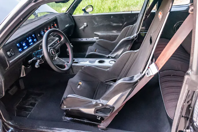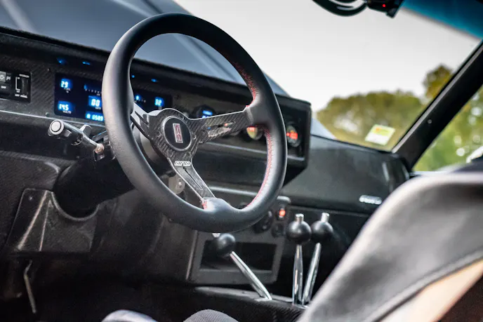 This Cutlass interior is also a real attention-grabber, with custom carbon-fiber parts and pieces throughout. These touches include a set of Kirkey racing seats, some Dakota Digital and AEM gauges, and King’s very own handmade carbon-fiber center console, door panels, steering wheel, sill plates, dash, and more. However, as impressive as these additions may be, one of our favorite parts of this car is the “lightning rod shifters” stuffed within that carbon center console.