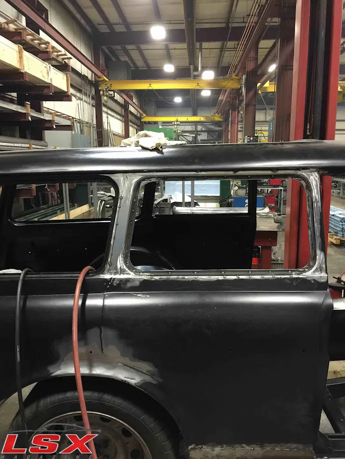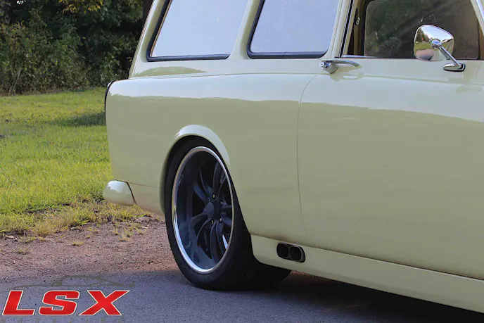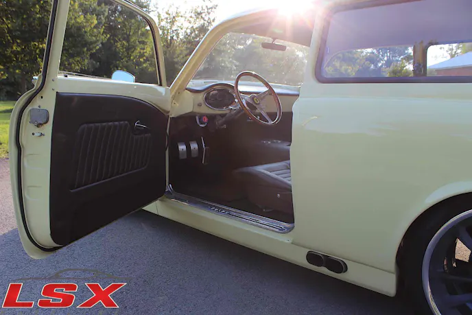 “I got the car back and I got looking at it, and looking at the coupes, and I realized that the front architecture on the door on a coupe had a longer door but the architecture was the same at the window,” Greg pointed out. “So I found a donor coupe and cut the doors and pillar off it and made this into a two-door wagon. From there the wheels went off the wagon.”
