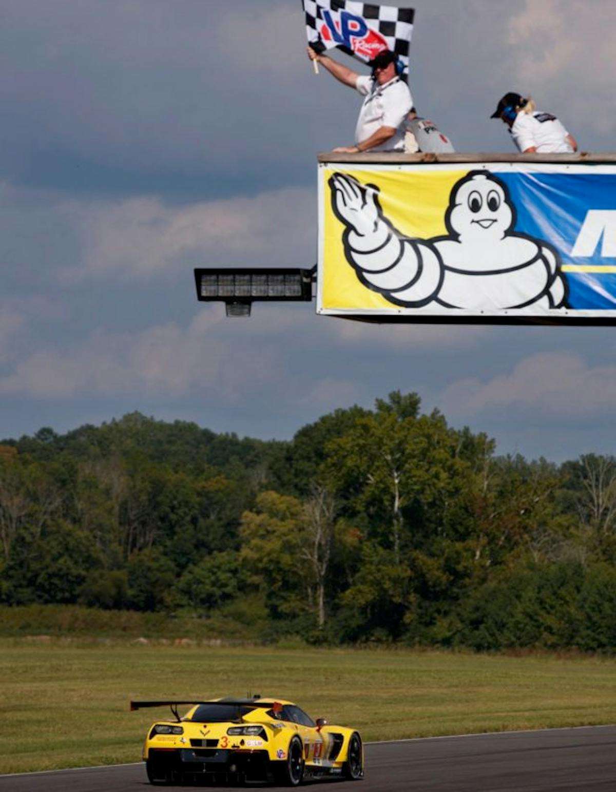 The final stop for the No. 3 Corvette saw Garcia rejoin in third place and directly ahead of the No. 67 Ford GT. After two stellar laps on cold tires to build up grip on the Corvette, Garcia put his sights on the No. 25 BMW of Bill Auberlen/Alexander Sims and the No. 62 Ferrari of Giancarlo Fisichella/Toni Vilander. The No. 62 Ferrari went off-track from second place with 32 minutes to go, and Sims in the lead BMW was forced to pit for a late-tire change with 10 minutes left. Up until the BMW pitted, Garcia had made up many seconds on the lead car but the crew was nervous about making it to the end of the race on fuel without a yellow flag period. The entire race ran without a full course caution.