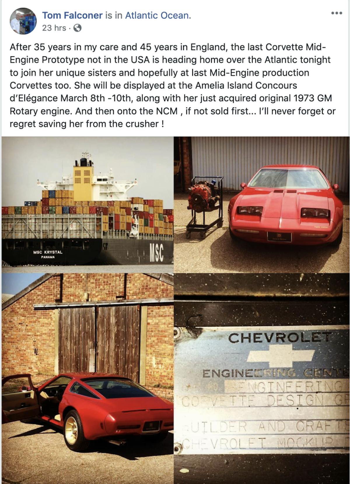 Browsing Facebook last night, I spotted an intriguing post from Tom Falconer. Tom is a fellow Brit who has always been intertwined with my personal Corvette story. We became friends when at the age of 21, I received one of his books as a birthday present from a thoughtful friend. Tom has put me in touch with his contact for all of the cars he’s imported into the UK from the States. I subsequently went to Tom whenever I was looking for a Corvette when I lived in the UK. We are both authors of Corvette-related books and see each other most years at Le Mans. We are friends on Facebook and this post popped up on my Facebook feed last night.