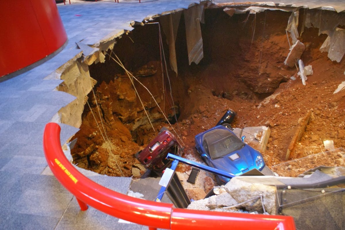 Proving that fact is every bit as gripping as fiction, earlier this year, on Wednesday, February 13th, 2014 a car-nivorous sinkhole opened wide under the National Corvette Museum swallowing eight cars. At 5:44 a.m. motion detectors were set off and the local police were alerted. “Security cameras at the museum caught the destruction,” explained Executive Director Wendell Strode. “When emergency personnel got to the museum, they discovered a sinkhole 40 ft wide and 25 to 30 ft deep.” It’s pretty significant,” he added.