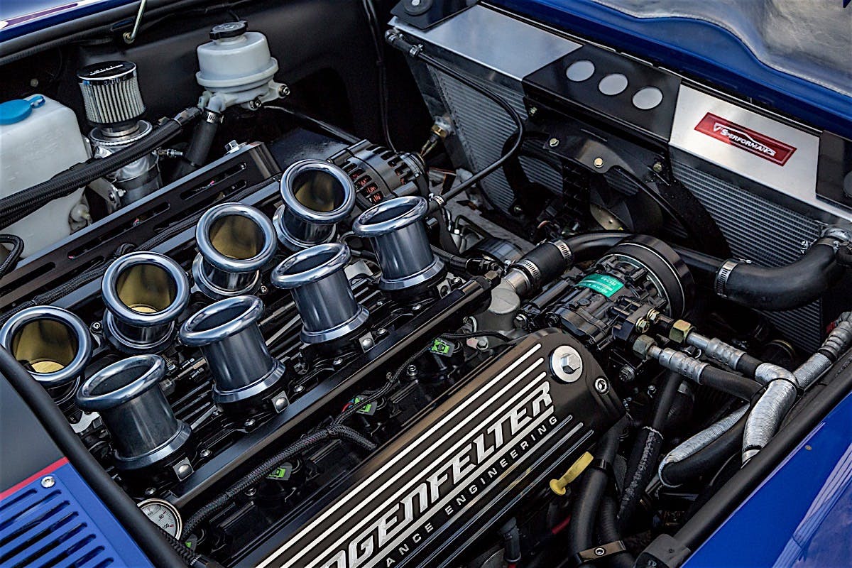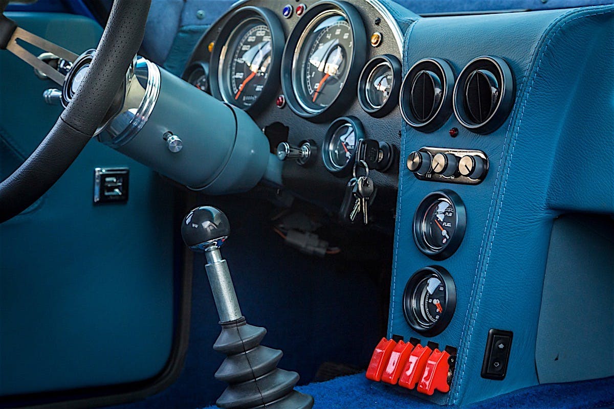 As mentioned, it really has the driving feel of a period car. The steering wheel had some play, as did the brake pedal. As a matter of fact, the first 500 yards down the street, I caught myself pumping the brakes, thinking there was no brake pressure. Once I understood that the brakes really began to engage about half way to the floor I could work with them. The big vented Wilwoods, which are standard on the car, get the car slowed like throwing an anchor out the window. The Tremec T-56 Magnum six speed transmission was fluid and smooth as I shifted throughout the gears.