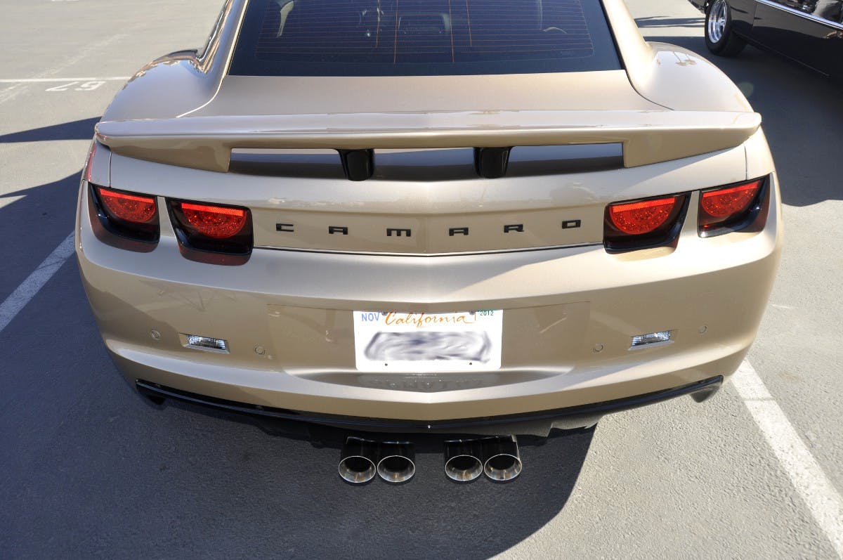 The Gold Camaro’s modifications aren’t just skin deep – it’s got plenty of performance to back up its aggressive looks. Flip open the hood to the front (Corvette style) and you’ll find an Edelbrock E-Force Supercharger bolted to the top of the stock LS3 engine. The Edelbrock “aluminum-lung” easily bumps the power output up into the 500 horsepower range, while one of Maganflow’s quad-tip center exit exhaust systems let everyone know the car has arrived.