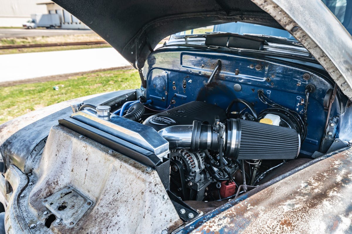 With the chassis and paint buttoned up on the old Chevy, it was time to move on to the powertrain. For the engine, Casey opted for a 5.3-liter LS out of a 2003 GMC Yukon. He used Summit Racing exhaust manifolds, custom motor mounts, a Chevrolet Performance GM muscle car oil pan, PCM tune, reworked factory wiring harness, polyurethane mounts, and a set of Taylor 8mm spark plug wires.