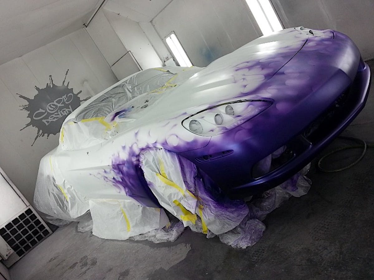 Thompson continued, “So I called up my dear friend, Ken at Badger Air Brush to get a few new guns for the job. A few special purples and blues were mixed in-house, using BASF Carizzma bases and dyes that we dubbed ‘Viking Purple’ and ‘Conner Blue’. After coming up with the paint colors, it was time to give the car a fresh base coat of BASF white. ”
