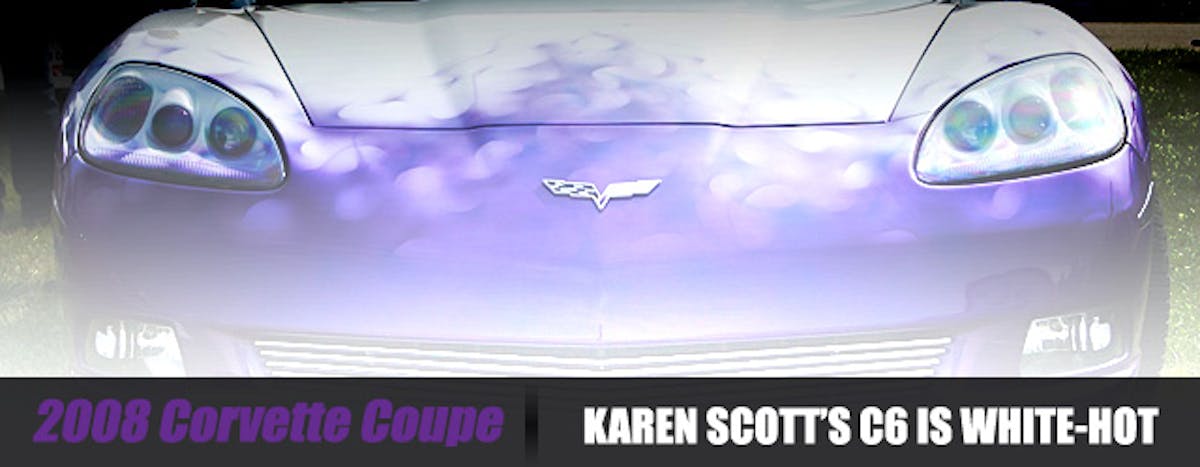 We reached out to Robert “Cope” Thompson Jr., of COPE Design, regarding the custom paint work on the C6, and he was more then happy to fill us in on some of the details that went into this Vette’s eye-catching color scheme. “COPE Design had a blast working on Scott’s corvette. It’s always a challenge when doing a Corvette for a woman, since most of the time you think it’s going to be a ‘Barbie’ corvette. Karen Scott loved my airbrushing and flames so she wanted some true fire on the front flowing to the sides. Easy, normally, but not on a white car with dark colors.”