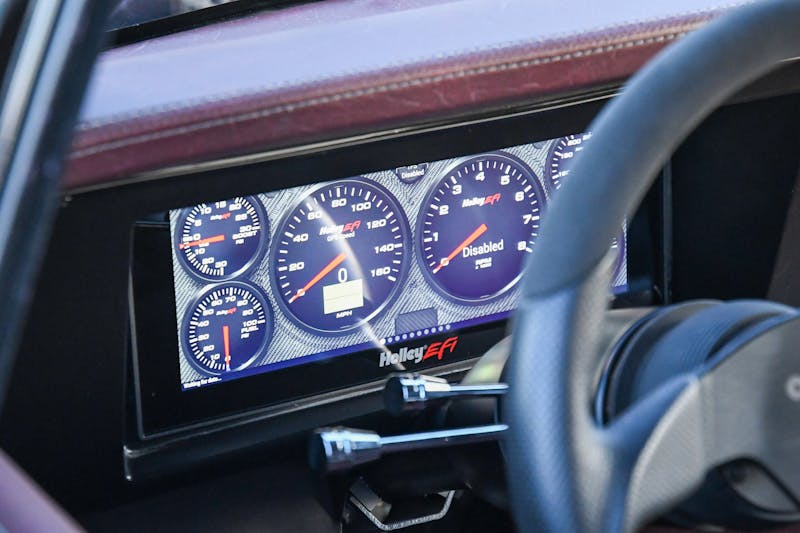 Stepping inside the Nova’s cabin reveals a cockpit tailored for performance and safety. The fabricated carbon-fiber dash, meticulously designed by Kenny Pfitzer Designs, houses a Holley 12.3-inch Pro Dash, providing Ken with real-time information. The interior’s visual appeal was enhanced by TMI door panels and Pro Chicane II seats, featuring a captivating combination of distressed blood red and black carbon-fiber weave synthetic leather.