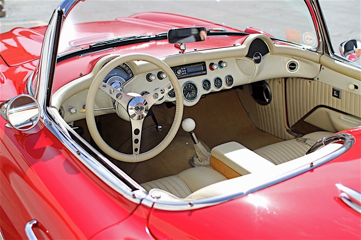 Jim says, “The decision to have Newman make up a set of 16 inch modern steel wheels with ’57 dog dish hubcaps came from my fond appreciation of 1957 Corvettes with the big brake option and all of them rolled off the line with the small caps back in the day.” The car currently rides on 16 inch, blackwall Michelin radials.
