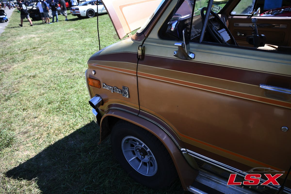 Joe Ivans, Pete Johnson, and Doug Johnson showed up for LS Fest in a van from Greenwood, Indiana — this 1978 G20 Custom van was initially built by LRP way back in ’78. The only thing that would give it away on any given day was the fender-exit-exhaust protruding on the driver’s side. The rustic time-capsule was complete with a plush ’70s interior and a gold, brown, tan, and orange paint scheme with the perfect degree of patina.