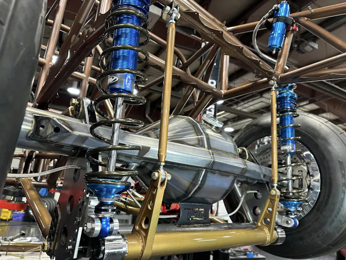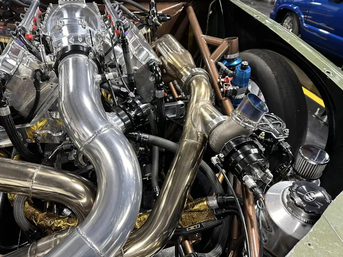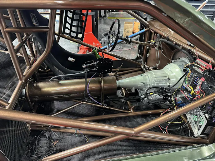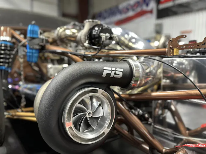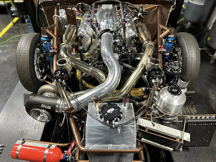 Sending power to the rear is an FTI Powerglide transmission with a 1.58:1 low gear, a 264mm bolt-together converter specced by Pete Nichols at Circle D, and a carbon fiber driveshaft from Precision Shaft Technologies. Feeding enough fuel to this engine for over 2,000 crank horsepower takes a big fuel system. Kenny uses a 17.5 gpm Waterman cam-driven fuel pump to supply VP Racing Fuels M1 methanol to Fueltech 720 lb/hr injectors. Controlling everything is a Fueltech FT600 ECU with Fueltech’s generic V8 wire harness. The car was wired entirely by Kenny and his brother, Tim Webster.