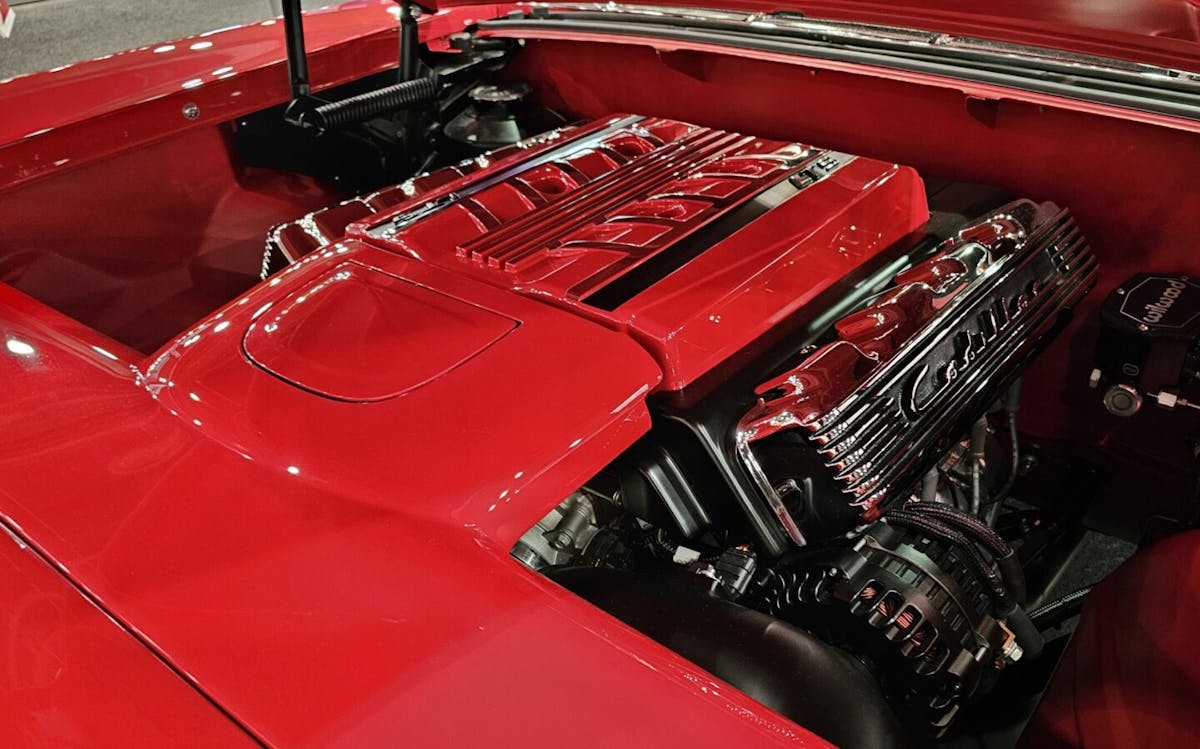 The interior saw a metamorphosis as well. The car’s formerly turquoise cabin had seen better days. Paul Atkins Interior out of Hanceville, Alabama, tackled the cockpit. They added 1959 Cadillac bucket seats, a custom console, and then covered everything in red leather. Dan Baker from Alumicraft fabricated interior pieces that have been “extinct” for some time. Mike’s team added Vintage Air, for front and rear passengers, Dakota Digital gauges, and a Bluetooth sound system from RetroSound. The icing on the cake was a small-diameter custom steering wheel that looked like it came off a GM assembly line in 1957. Again, Mike Curtis of Curtis Speed did an outstanding job.
