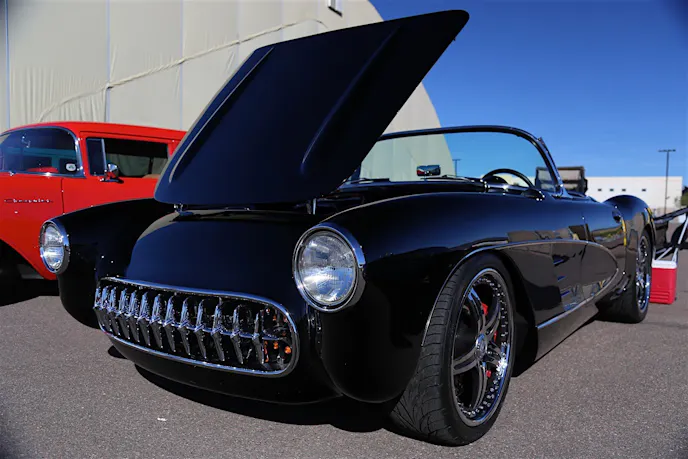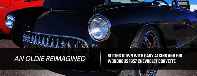 Strolling around at the 18th Goodguys Southwest Nationals in Scottsdale, Arizona, we stumbled across a custom that is an oldie but a goodie. Behold, Gary Atkins’ wondrous 1957 Chevrolet Corvette, which has a few tricks up its sleeve. Gary, a native of Scottsdale, had much to say about his beloved custom. “It took seven years to build this beauty,” he said. “I’d like to thank Bill Dawson at Corvette Correction for helping me make all of this possible.”