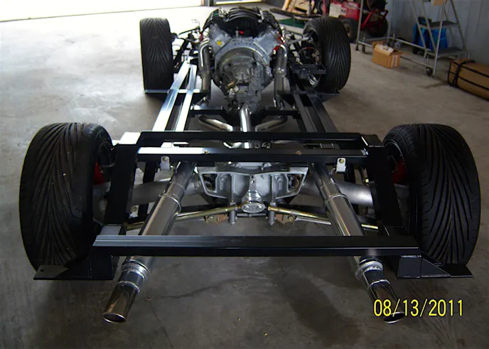 The chassis is custom-built by Bill Dawson, which consists of a C5 front and rear chassis. The suspension setup is also from a C5, a monoleaf configuration with trailing arms, which features front and rear independent suspension.