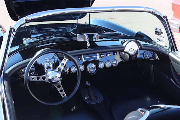 The all black interior has intricate red stitching, a nice complimentary color to the dark interior palette. The gauges are the original ones, redone by Classic Instruments. A hidden Kicker sound system and Vintage Air make for a comfortable and enjoyable experience during the scorchers in Arizona.