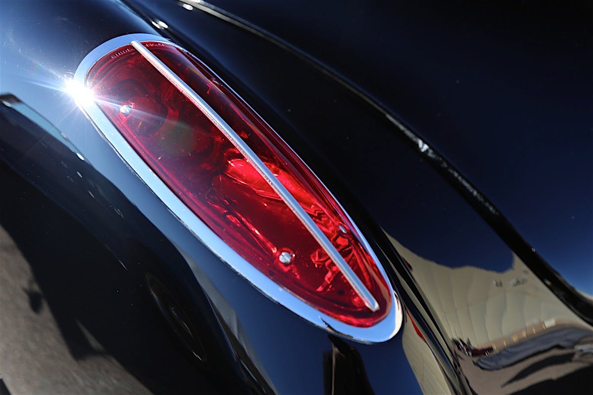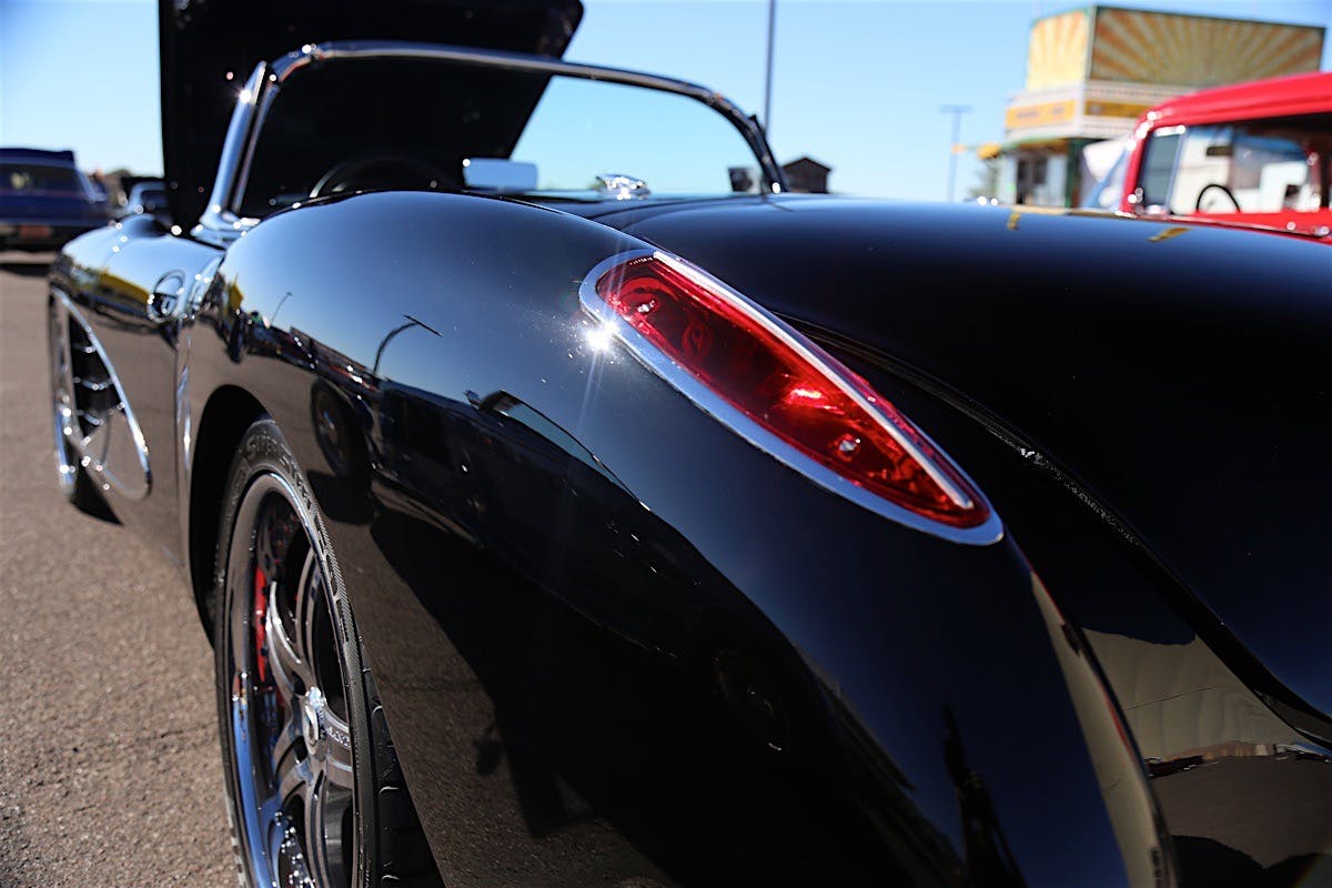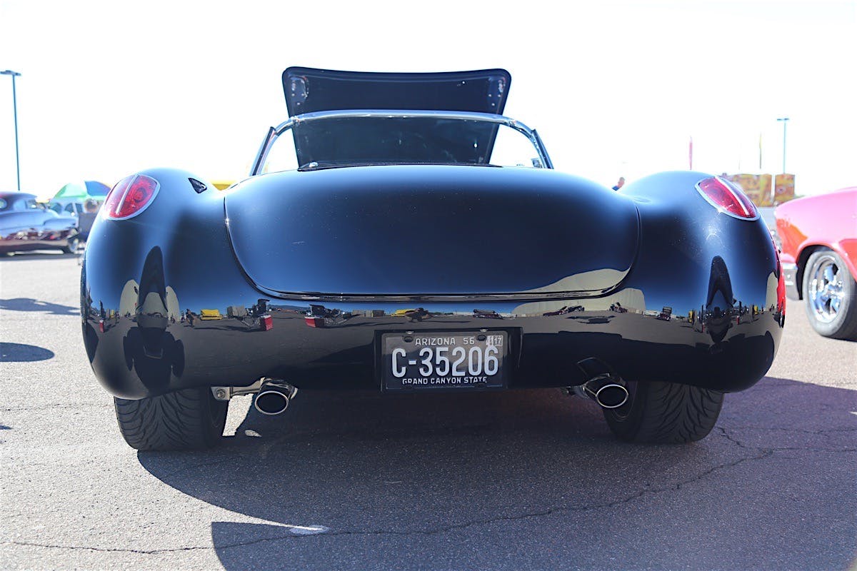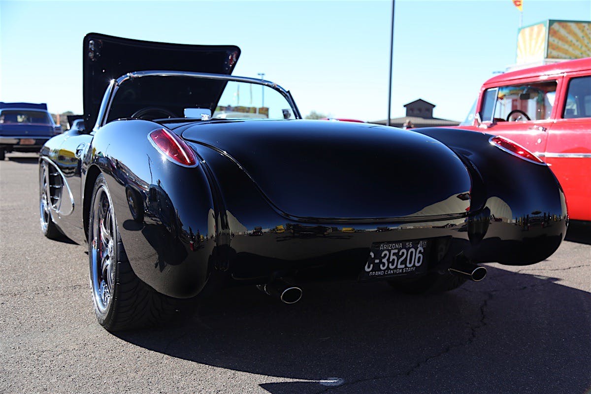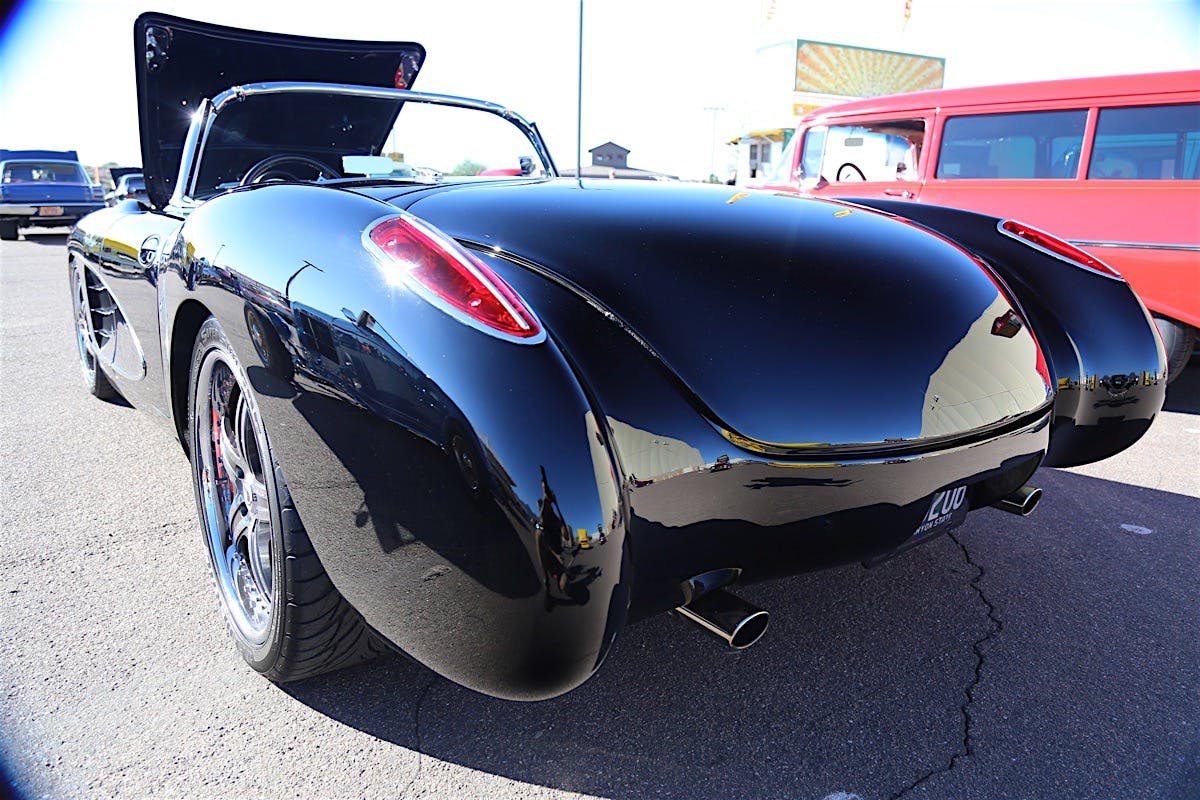 The door handles stem from a fifth-generation C5 Corvette and the rear quarters were widened 3 1/2 inches on both sides to fit a wider set of wheels. “It took us twice to make these right,” Gary said. “We shaved the emblem off of the rear, and also removed the bumperettes out back, letting the gorgeous black paint really shine all on its own without all of the chrome in the way.”