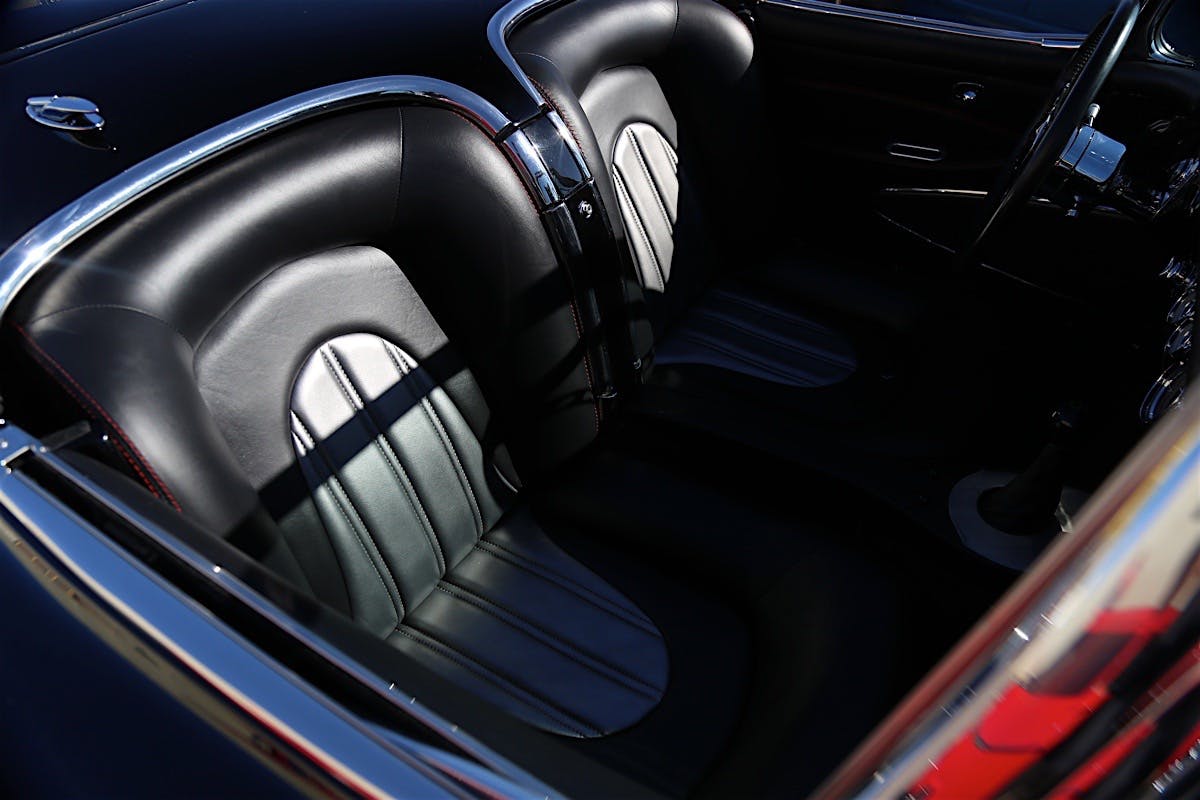 The all black interior has intricate red stitching, a nice complimentary color to the dark interior palette. The gauges are the original ones, redone by Classic Instruments. A hidden Kicker sound system and Vintage Air make for a comfortable and enjoyable experience during the scorchers in Arizona.