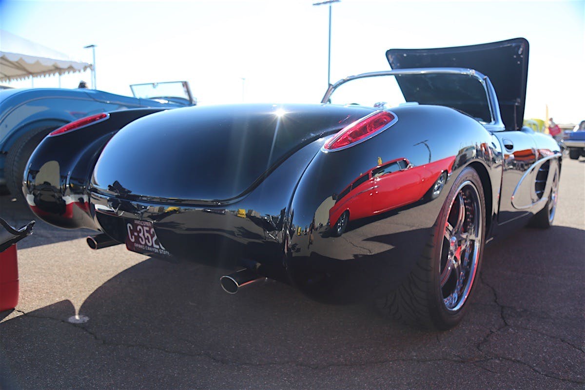 Strolling around at the 18th Goodguys Southwest Nationals in Scottsdale, Arizona, we stumbled across a custom that is an oldie but a goodie. Behold, Gary Atkins’ wondrous 1957 Chevrolet Corvette, which has a few tricks up its sleeve. Gary, a native of Scottsdale, had much to say about his beloved custom. “It took seven years to build this beauty,” he said. “I’d like to thank Bill Dawson at Corvette Correction for helping me make all of this possible.”