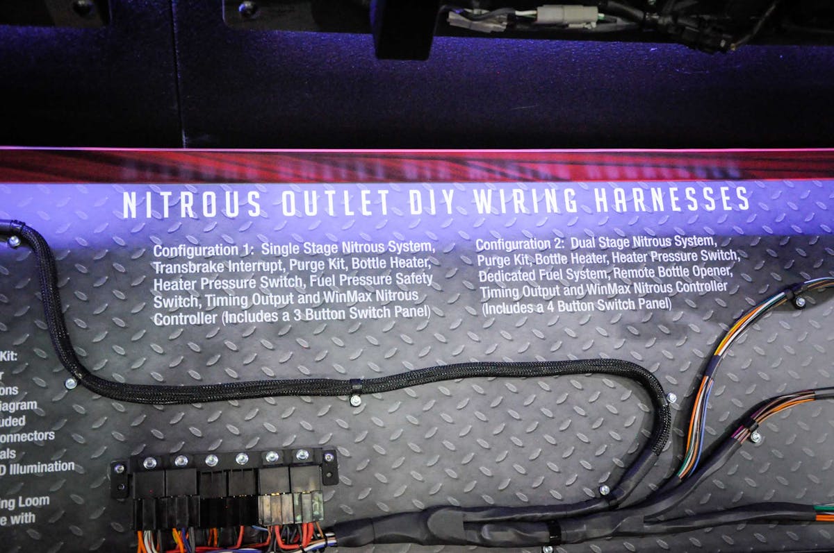 Stage 2 harnesses bring a little more to the table. Configuration one is a single-stage system and features a transbrake interrupt, purge kit, bottle heater, and heater pressure switch, fuel pressure safety switch, timing output, and a WinMax nitrous controller. Configuration two brings an additional dual-stage nitrous system, purge kit, bottle heater and heater pressure switch, a dedicated fuel system, timing output, and WinMax nitrous controller. There is also a remote bottle opener circuit and a four-button switch panel.