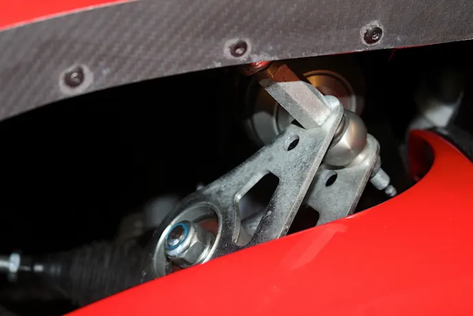Suspending the mass of the R1 and maintaining a favorable contact patch are Öhlins coilovers, mounted inboard, and are pushrod/rocker arm actuated. Double A-arm and wishbone control arms keep everything located in space