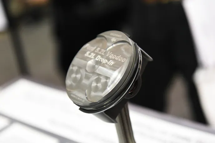 The drop-in pistons are designed for the enthusiast with a newer engine that doesn’t require the typical machine work of a worn-out power plant. By swapping the OEM pistons with these forged drop-in units, the enthusiast can install a power adder to their vehicle safely. Joe Maylish, marketing manager of MAHLE, showed us a set for the Chevrolet 5.3-liter L83 engine along with a set Ford 5.2-liter VooDoo drop-ins. Joe said, “The 5.3-liter pistons are made out of a 4032 alloy, and offer a GRAFAL anti-friction skirt coating for reduced drag.”
