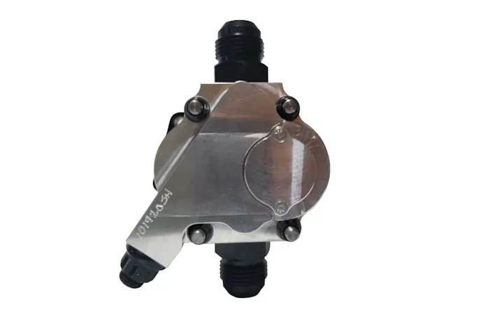 The pump includes replaceable fittings to simplify system integration. The pressure section features -12AN inlet and outlet ports, the scavenge inlets are -12AN, and the return uses a -16AN fitting. This configuration allows flexibility when pairing the pump with different dry sump tanks, hose routing layouts, and chassis designs.