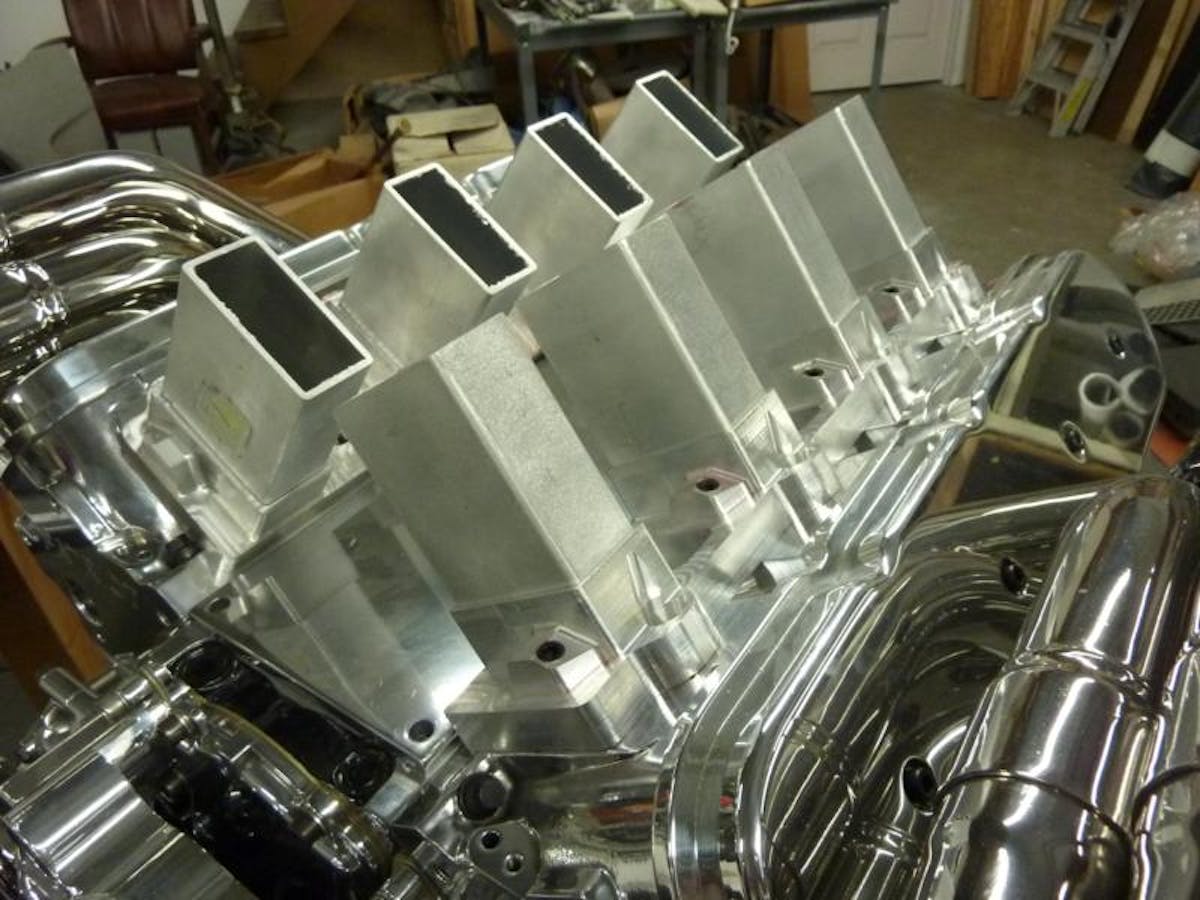 The intake manifold is a custom sheet metal tunnel ram design fed by a custom carbon fiber and billet aluminum scoop. This, in addition to the throttle body (below), is Oyler’s favorite custom component on the car so far.