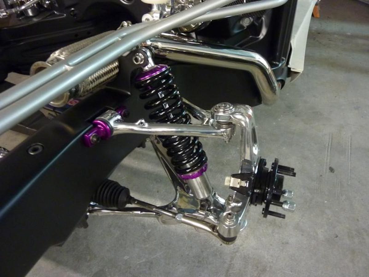 For the suspension, Oyler has opted to keep with the traditional C5 setup with the addition of polished and anodized QA1 AlumaMatic coilovers, as well as black powder coated 350 lb springs, spherical bearings, and steel roller thrust bearings, all from QA1. The suspension also features polished and plated rod ends and C6 ZR1 swaybars.
