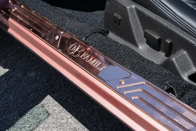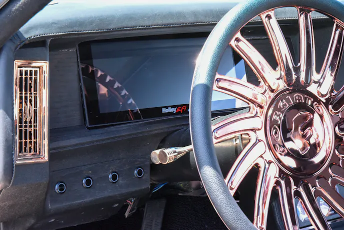 The interior of the Caprice Donk is adorned in black leather and Rose Gold accents. Builds like this are typically full of details that can capture your attention for hours, and Alex’s Caprice Donk is jam-packed with custom touches that make it one-of-a-kind. Aside from the wheel-matching Forgiato steering wheel, the interior features door locks, sill plates, vents, strikers, and a rear-view mirror from Sandman Designs that are custom engraved and coated in Rose Gold. The dash, center console, door panels, and the rest of the interior are all custom-made by RK Customs. A Holley EFI digital screen that is connected to the Dominator ECU is mounted in the dash to keep an eye on the engine’s vitals. And no custom car of this magnitude would be complete without a custom sound system. In the trunk of the Caprice are two Ground Zero 15-inch subwoofers a Soundigital 8k amp. The custom enclosure along with the rest of the stereo, wiring, and lighting, was completed by Car Audio Engineers in Sacramento, California.