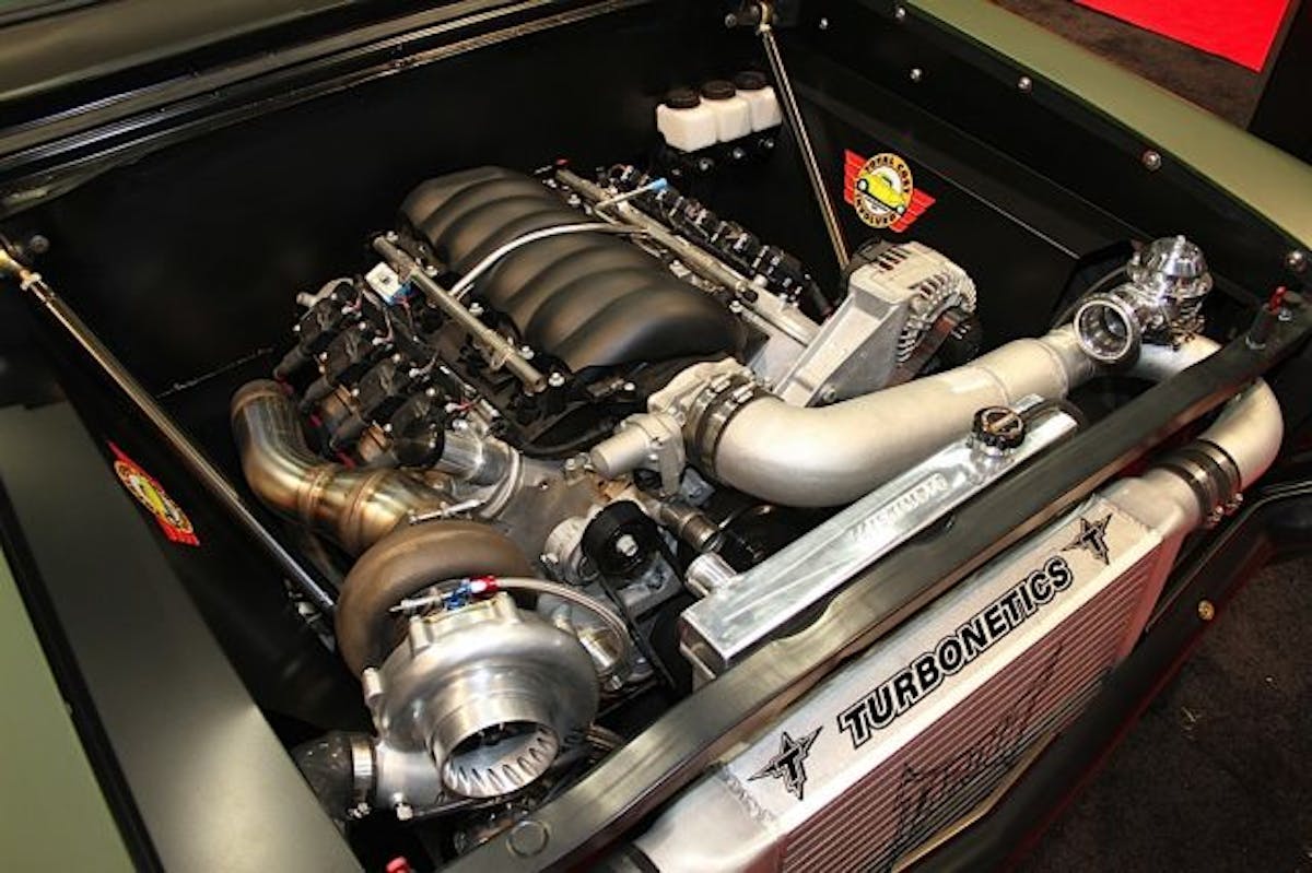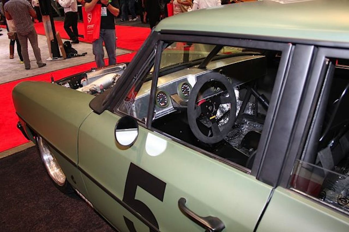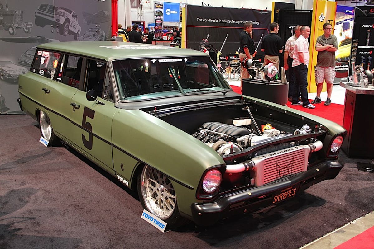 The obvious solution is right here: Tapout co-founder Tim “Skyscrape” Katz’ 1966 Chevy Nova station wagon. We got to see this work in progress at the 2012 SEMA show, courtesy of Turbonetics, who are helping turn the stock LS3 between the fenders into an 850 horsepower fear generator.  A “mid frame” 76mm GT-K turbo with a 75mm turbine wheel will be pushing boost, controlled by a 50mm Newgen wastegate and a 50mm Godzilla blowoff valve, and cooled by a custom Spearco air-to-air intercooler.
