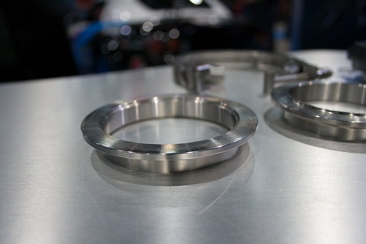 Aaron Weir with technical support met with us and said, “As far as new products, we have been developing a flange sweep for a Garrett turbo, and have been working on a prototype exhaust resonator that will be tunable by the end user. As far as products that continue to be popular, we do well with our V-band assemblies for the exhaust side, whether right off of the turbo or further down stream of the exhaust system. These essentially replace a traditional two or three-bolt flange, and have a quick release mechanism to access it quickly at the track. The bonus feature is that it eliminates the need for a gasket because there are male and a female sides, which eliminates both leaks and misalignments. This also gives a completely smooth interior for maximum flow through.”